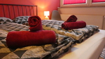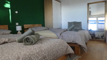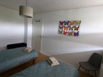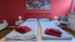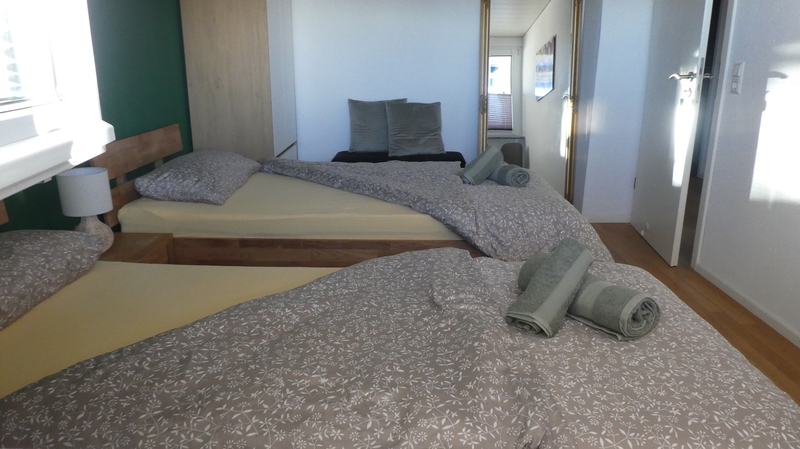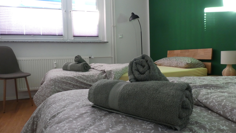 Im grünen Zimmer gibt es zwei Einzelbetten mit Federkern Matratzen, du hast einen Kleiderschrank für alles was während deines Kurzzeitaufenthalts ordentlich versorgt werden muss. Auch hier können 2 Personen übernachten.
