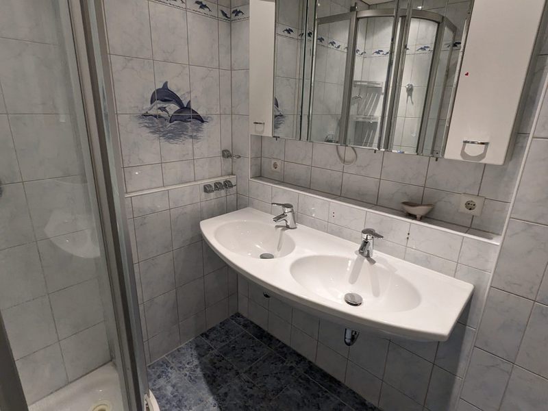Grosses Bad mit zwei Lavabos und Waschmaschine.