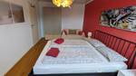 Das rote Zimmer hat ein 160 cm breites Doppelbett, einen geräumigen Kleiderschrank und eine Sofaecke - Du hast einen Ausblick in Richtung Weiler Weinberge. Hier können 2 Personen übernachten.